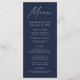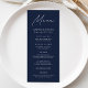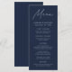 Entspannen Sie bei einem Hochzeitsempfang mit unserem wunderschön gestalteten Hochzeitsmenü, das mit einem handgeschriebenen weißen Skript auf marinischem Hintergrund aufwartet. Dieses moderne Design ist perfekt für Paare, die ein schlichtes und dennoch raffiniertes Aussehen suchen. Es lasse Ihnen, sich mit Ihren Namen, Ihrem Hochzeitstag und dem Menü-Angebot persönlich zu fühlen. Sein minimalistischer Stil ergänzt mühelos jedes Hochzeitsthema und sorgt für eine Touch Eleganz. Lassen Sie sich von einem Menü beeindrucken, das die schicke Einfachheit Ihrer Hochzeitsvision widerspiegelt.