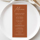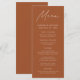 Entspannen Sie bei der Hochzeitsfeier mit unserem wunderschön gestalteten Hochzeitsmenü, das mit einem handgeschriebenen weißen Schrift auf Terrakotta-Hintergrund besticht. Dieses moderne Design ist perfekt für Paare, die ein schlichtes und dennoch raffiniertes Aussehen suchen. Es lasse Ihnen, sich mit Ihren Namen, Ihrem Hochzeitstag und dem Menü-Angebot persönlich zu fühlen. Sein minimalistischer Stil ergänzt mühelos jedes Hochzeitsthema und sorgt für eine Touch Eleganz. Lassen Sie sich von einem Menü beeindrucken, das die schicke Einfachheit Ihrer Hochzeitsvision widerspiegelt.