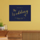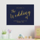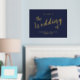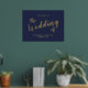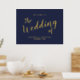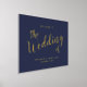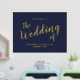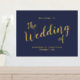 Modernes Script Navy und Gold Wedding Begrüßungszeichen mit dem Titel in modernem goldenen Script Schriftart mit Details in goldmodernen Sans Serif Schriftart auf marineblau Hintergrund.