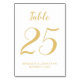 Moderne Script White and Gold Wedding Tischnummer mit Titeln in goldfarbenem, modernem Script Schriftart mit Details in goldfarbenem Sans Serif Schriftart auf weißem Hintergrund. Bitte beachten Sie: Die Details der Folie werden im Kunstwerk simuliert. Bei der Herstellung dieses Produktes wird keine Folie verwendet.