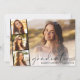 Elegantes Script Foto Overlay Graduation Party Einladung flache Karte mit dem Foto des Absolventen überlagert mit einem Streifen von drei kleineren quadratischen Fotos und "Graduate" in einem dünnen modernen Drehbuch und ihren Namen und Klasse Jahr in einfachen Typografie. Auf der Rückseite fügen Sie die Details der Graduierungsparty hinzu.