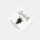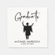 Maßgeschneiderte Servietten für sein Graduiertenparty-Party mit einer Silhouette-Illustration eines männlichen Absolventen, der in seiner Kappe und in seinem Kleid feiert, "Graduate" in einem modernen Drehbuch und seinen Namen und Klassenjahr in einfacher Typografie.