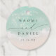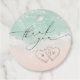 Schöne türkisfarbene abstrakte Aquarell glitzernde Ozeanwelle und Herzen im Hintergrund des Sandstrandes, mit stilvollem Drehbuch und eleganten Serif-Schriftart, Paare Namen auf der Rückseite, modern und einfach. Wir danken Ihnen für die Hochzeit von Wasserstraßen, tropische Hochzeit in Urlaubsort, Hochzeiten zum Thema Küstenmeere im Sommer.