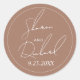 Moderne Drehkalligraphie mocha minimalistische Hochzeit Classic Round Sticker. Es zeigt die Namen des Paares schön gerendert in chic Skript Kalligraphie in weiß auf mocha Farbe.