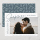 Erfahren Sie mehr über Ihre überraschende Verlobung mit diesen eleganten Foto Verlobung Ankündigungen. Im Design steht die Phrase "Überraschung, wir got verlobt!" in einem trendy rauchigen, blau-graufarbenen Drehbuch und moderner Schrift. Ihr Verlobung-Foto wird im rechten Mitte-Teil des Designs angezeigt, wobei Ihr Name und das Datum der Verlobung auf dem links angezeigt werden. Personalisieren Sie die überraschende Verlobung Ankündigung, indem Sie weitere Details wie Hochzeitsstadt/Staat, Hochzeitswebsite, etc. hinzufügen. Die Ankündigung kehrt zurück, um ein weißes Blattmuster auf einem blau-grauen Hintergrund anzuzeigen.