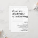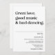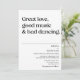 Gute Liebe, gute Musik und schlechtes Tanzen. Modernes, lustiges minimales Design mit angesagter Typografie auf weißem Hintergrund. Der Text kann leicht für ein einzigartiges Design für Ihren besonderen Tag personalisiert werden.