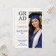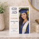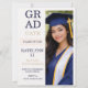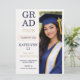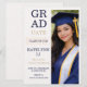 Moderne Split-Layout-Gestaltung mit cremefarbenem texturiertem Hintergrund, fetter gestapelter Graduiertentypografie und einem vertikalen Porträtpanel in Navy- und Champagner-Tönen. Entwickelt für Anmeldungen zur Abschlussfeier an einer High School, die ein Seniorenporträt hervorheben und gleichzeitig Details zur Zeremonie und Feier bekannt geben.