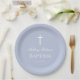 Moderne Tauf-Papierteller mit einem staubigen, blauen Hintergrund und einem weißen Kreuzdesign. Perfekt, um Ihre Feier mit einem sauberen und modernen glaubensbasierten Thema zu koordinieren.