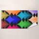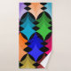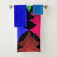 Dieses Handtuch-Set ist mit einem Badehandtuch in modernem Retrodesign in Rot, Orange, Gelb, Grün, Blau und lila, einem hellblauen Waschtuch und einem dunkelblauen Handtuch ausgestattet.