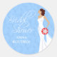 Ein Brautduschaufkleber für die moderne Braut. Eine königliche Braut steht vor einem Vintagen, hellblauen, blumengeschmückten gemusterten Hintergrund. Benutzen Sie es auf Ihren Einladungen, Plakaten oder zum Siegel Günstige Taschen. Erhältlich in alternativen Farben. Kontaktieren Sie mich, wenn Sie eine andere Farbkombination und/oder eine andere Braut suchen. Passende Einladungen und Porto verfügbar.