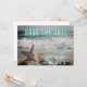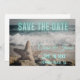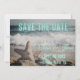 Moderne, nicht-traditionelle Ankündigung Datum freihalten mit gedämpfter Strandszene (die Wellen und Seesterne im Sand umfasst) fotografischer Hintergrund mit Save the Date in aquablau Neon. Personalisieren Sie mit den Details des Ehepaares.