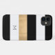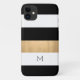 Elegantes iPhone 11 Gehäuse, mit einem modernen, fett weiß, schwarz und goldfarbenen horizontalen Streifen Muster. Personalisieren Sie das Monogramm mit einem Buchstaben als großartige Geschenkidee.
