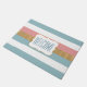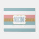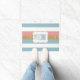 Chic Vordertür Matte in rosa, weiß blau und goldgestreiftem Muster. Ein weißer, dekorativer Textbereich, in der Mitte der Matte, ist mit blauem Text versehen, der personalisiert werden kann. Was für eine schöne Art, Gäste auf Ihrem Zuhause willkommen zu heißen.