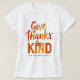 Dieser moderne Erntedank-T - Shirt wurde entworfen, um mit seinem kühnen Pinselskript in lebhaften Herbsttönen gebrannter Orange, Gelb, Terrakotta und Rot inspirieren, mit der aufregenden Meldung "Give Dankbarkeit, Be Kind". Die große, auffällige Kalligraphie schafft ein festliches Statement-Stück, während die individuell anpassbare Namensoption in sauberer, moderner Typografie sie einzigartig macht. Dieses inspirierende Erntedank-Shirt, das für Erntedank-Dinners, Party, Ansammlungen, Familienfeiern und Fotos in der Feriengruppe geeignet ist, verbindet Stil und Positivität und sorgt für eine warme saisonale Touch.
