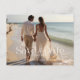Modernes, schlichtes Design mit dekorativer Typografie und einem eleganten Kalligrafieschreiben mit einem vollen Foto vorne und einem kleineren auf der Rückseite eines rot-rosa Hintergrunds. Stellen Sie einfach Ihre personalisierten Details Ihrer Wahl ein. Eine großartige Möglichkeit, Ihre Hochzeit anzukündigen, und ideal für jeden Hochzeitsort.