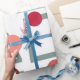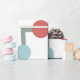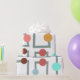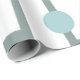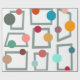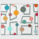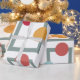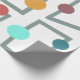Dieses Verpackungspapier hat ein modernes Design von grauen Trapezoiden aus der Mitte des Jahrhunderts mit bunten Kreisen auf ihnen.