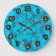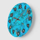Künstlerische moderne Küchen- oder Schlafzimmeruhren, die in einem schönen türkisfarbenen Muster-Hintergrund gestaltet sind, der das blaue Mohablau türkis nachahmt.