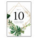 Elegante tropische Tischnummern mit der Tischnummer, umgeben von einem geometrischen Rahmen aus vergoldeten Imitaten und tropischen tropischen grünen Aquarellbildern. Das Design wiederholt sich auf der Rückseite der Karte. Entworfen, um mit unserer Tropical Gold Hochzeitskollektion zu koordinieren. Um jede Tischnummer zu bestellen, geben Sie einfach die Nummer ein und fügen Sie sie Ihrem Warenkorb hinzu. Wiederholen Sie die Schritte für jede Nummer, bis Sie fertig sind.