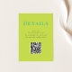 Die Hochzeitsdetails-Eintrittskarte mit QR-Code aus der Leilani-Sammlung bietet helle, kühne Farben und moderne Typografie, die Ihren Gästen einen bleibenden Eindruck hinterlassen! Personalisieren Sie es einfach und schnell mit Ihren Daten. Klicken Sie einfach auf den Button "Anpassen", um Stil und Position des Textes zu verändern und zu formatieren.
