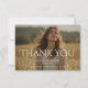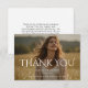 Drücken Sie Ihre Dankbarkeit mit dieser modernen Dankes-Fotokarte zum Schulabschluss aus. Das Design verfügt über eine elegante Typografie mit einer großen "DANKE" -Nachricht, die über einen schönen Vollfoto-Hintergrund platziert ist. Die saubere und verfeinerte Schrift schafft ein anspruchsvolles Aussehen, während das Foto des Absolventen im Mittelpunkt bleibt.