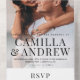 Ein modernes Overlay mit großen Namen und ein volles Foto sind die Merkmale auf diesem alles in einer Hochzeitseinladung mit einer Antwortkarte. Klicken Sie auf die Schaltfläche Bearbeiten, um dieses Design anzupassen.