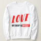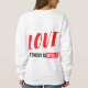 Eine moderne Typografie entwarf Sweatshirt für Weltfrieden. Dediziert für alle Frauen, die an Einheit, Liebe und Harmonie glauben. Die Vorderseite und die Rückseite sind in Text mit rot, schwarz und weiß kombiniert. Die gesamte Konstruktion ist individuell einstellbar, verkleinert oder verschiebt die Position nach Ihren Wünschen.