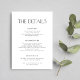 Elegante trendige Schwarz-Weiß Hochzeit Einladung Gastinformationen Details Umschließung Karte mit einfachen zeitgenössischen Stil Typografie. Ein stilvoller Weg, um Ihren Gästen alle wichtigen Unterkünfte, Anleitungen und andere Details über Ihre Hochzeitsfeier und Ihren Empfang zu geben.