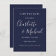 Diese elegante blau-weiße Save the Date-Karte mit ihren charakteristischen Stilnamen kann mit den besonderen Details des Hochzeitstages in modernen weißen Schriftzeichen personalisiert werden. Entwickelt von Thisisnotme©