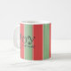 Eine festliche Tasse im schicken Retro-Stil mit fetten Streifen in einem Vintagen modernen Farbschema Mitte des Jahrhunderts, das korallenrot und mildes Grün mit beigen Akzenten umfasst. Freude an der Arbeit Text ist in einem skurrilen Typ Gesicht geschrieben.