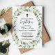 Diese moderne grüne, einfache Cross-Taufen Einladung ist perfekt für eine Aquarelltaufe. Das Design besticht durch einen eleganten grünen Blattkranz, der die natürliche Schönheit inspiriere.