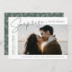Erfahren Sie mehr über Ihre überraschende Verlobung mit diesen eleganten Foto Verlobung Ankündigungen. Im Design steht die Phrase "Überraschung, wir got verlobt!" in einem trendigen, dunkelgrünen Schriftsatz und moderner Schrift. Ihr Verlobung-Foto wird im rechten Mitte-Teil des Designs angezeigt, wobei Ihr Name und das Datum der Verlobung auf dem links angezeigt werden. Personalisieren Sie die überraschende Verlobung Ankündigung, indem Sie weitere Details wie Hochzeitsstadt/Staat, Hochzeitswebsite, etc. hinzufügen. Die Ankündigung kehrt sich um, um ein weißes Blattmuster auf einem dunklen Laubhintergrund anzuzeigen.