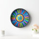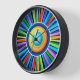 Augenfaszinierende Rundwand-Uhr mit einem abstrakten, geometrischen Sonnenaufgang mit gesättigten Regenbogenfarben, die aus konzentrischen Kreisen in der Mitte ausstrahlen. Präzise, vektorartige Streifen in Blues, Grüntöne, Gelb, Orangen, Rot und Purpur kontrastieren mit einem coolen blauen Hintergrund, während schmale schwarze Hände und ein matter schwarzer Rahmen das Aussehen sauber und modern behielt. Perfekt als Statement für Wohnzimmer, Büros, Klassenzimmer, kreative Studios oder Kinderräume - Energie, Farbe und zeitgenössisches Design in jeder Wand.