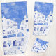 Ein blaues und weißes Aquarellbild des Dorfes Oia auf der griechischen Insel Santorin.
