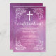 Unsere schöne, moderne Einladung zur Bestätigung beinhaltet einen Vintagen Scrollrahmen, ein weißes Kreuz und ein schicke extravagante Bestätigungs-Schriftart Set auf einem lila Aquarellhintergrund. Dreh unsere Bestätigungs-Einladung zu uns, um einen passenden Rücken für eine besondere Touch zu sehen. Perfekte Einladung für eine Girl-Bestätigung oder Jungs-Bestätigung. Besuchen Sie unseren Shop für diese Einladung in einer großen Auswahl an modernen und trendigen Farben.