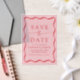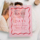 Ankündigen Sie Ihre Hochzeit im Stil mit unserem modernen Wavy Frame Vellum speichern Sie die Datumskarten! Mit ihren Namen und Hochzeitsdetails, elegant gerahmt durch einen fett roten Flügelrahmen vor einem weichen rosa Vellum-Hintergrund, schafft dieses Design einen bemerkenswerten Kontrast, der Charme und Eleganz ausstrahlt. Ideal für Paare, die eine einzigartige Mischung aus modernen Trends und Retro-Flair suchen, diese speichern die Daten so unvergesslich wie Ihre Liebe. Personalisieren Sie dieses Design, um die Begeisterung Ihres besonderen Tages zu teilen und Ihren Gästen einen wahren Schatz zu geben, den sie schätzen. Set den Ton für eine Feier voller Liebe und Stil!