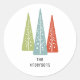 Diese runden Aufkleber machen großartige Umschlag Aufkleber für Weihnachtskarten und Feiertagseinladungen, oder verwenden sie, um Weihnachtsgeschenke oder Feiertagsgeschenke zu dekorieren. Die Aufkleber zeigen drei Weihnachtsbäume in hellgrün, hellblau und rot mit einem modernen Look aus dem Mittelalter. Fügen Sie Ihren Namen oder anderen Text unter die Grafik in schwarz-modernes Schriftsatz.