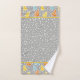 Moderne Bäume und polka dot muster Badetuch Set. Es zeichnet sich durch ein Muster moderner Weihnachtsbäume in Gelb, Orange und Aqua Blau auf grauem Hintergrund, Schneeflocken um sie herum und Polka Punkte.