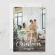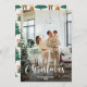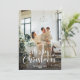Typografisches Foto Frohe Weihnachtskarte mit einem fallenden Schneeüberhang und einem Feiertagsgruß mit einer kreativen Typografie auf der Vorderseite und einem Wintermuster von Weihnachtsschmuck, Bäumen und Kindern, die Geschenke auf der Rückseite halten. Personalisieren Sie diese Foto-Urlaubskarte einfach mit Ihrem Foto und Familiennamen.