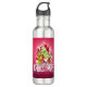 Wasserflaschen mit einer coolen Weihnachtsillustrierung. Der Text sagt frohe Weihnachten und Glück im neuen Jahr. Entworfen mit einem baumförmigen Hügel mit festlichen Schneeflocken, Sternen, Weihnachtsbaumbläsern und glänzend aussehenden Glitzern. Der Hintergrund ist eine lebendige rötlich-rosa Farbe.
