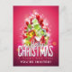 Party Einladung Postkarte mit einer coolen Weihnachtsillustrierung. Der Text sagt frohe Weihnachten und Glück im neuen Jahr. Entworfen mit einem baumförmigen Hügel mit festlichen Schneeflocken, Sternen, Weihnachtsbaumbläsern und glänzend aussehenden Glitzern. Der Hintergrund ist eine lebendige rötlich-rosa Farbe.