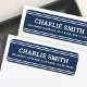 Dunkelblaue oder benutzerdefinierte Rücksendeadressen-Aufkleber mit weißen Linien oben und unten und Ihr Name in einem weißen, fett gedruckten Schriftart mit der Rücksendeadresse unten. Schriftart und Farben können mit dem Designwerkzeug angepasst werden.