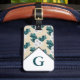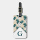 Moderne weiße ranunculus Blume und grüne Gepäckmarke mit personalisiertem Anfangsbuchstaben in Weiß.
