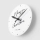 Diese personalisierte moderne Hochzeitswandeuhr besticht durch die Namen von Braut und Braut und das Jahr, das in der Hand mit einem schwarzen Schrift auf einem schlichten weißen Hintergrund festgehalten wurde. Ein einzigartiges Geschenk für Neuvermählte. Entworfen von Susan Coffey.