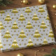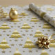 Dieses Weihnachtspapier enthält stilisierte Bäume mit abwechselnden weißen und goldenen Schichten, gepunktete Ornamente und glitzernde Silbersterne. Set vor einem silbergrauen Hintergrund. Das Design schafft klassische Urlaubeleganz mit moderner Drehung. Ideal für alle, die unter dem Baum ein wenig funkeln.