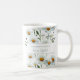 Moderne, feminine, blumengeschmückte Tasse. Schöne, weiße Gänse und grüne Blätter auf weißem Hintergrund. Perfektes Geschenk oder Zubehör!