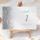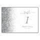Die links Seite dieser eleganten, modernen Hochzeitsfeier-Tischnummer besticht durch das Design eines Glitzer in Silber-Imitat. Der anpassbare Text kombiniert graue Handschrift, Copperplate und kursiv Schriftart auf weißem Hintergrund.