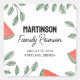 Dieser moderne Wiedersehen-Quadrat-Aufkleber der Familie weist einen Rand von handgezeichnet Zweigen grüner Blätter mit Keilen Wassermelone auf. Personalisieren Sie Ihre Daten mit Ihrem Familiennamen, Datum und Ort.