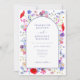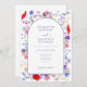 Schöne Aquarellfarben lila Bogen Hochzeitseinladung mit bunten Wildblumen und ideal für Frühjahr oder Sommer Hochzeit. Ein skurriles, aber stilvolles Design mit modernem Typografie-Skript mit leicht zu personalisierenden Vorlagen im lila. Wildblume Gemälde beinhalten lebendige rote Mohnblüten, Maisblumen, Kosmos-Blume, vergiss mir Noten und Knöpfe in lila, rosa, pfirsichgrün, aquamarin, orange und blau. Original botanische Kunstwerke der Künstlerin Catherine Sweetman