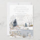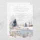 Schöne, moderne Einladungen für eine Winterhochzeit mit blauen und mochfarbenen Winterlandschaft eines Sees, Schnee und Bäume in Schieferblau und Bräune auf einem schneebedeckten Hang.
