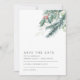 Diese moderne, elegante Winterhochzeit Save the Date besticht durch eine minimalistische Gestaltung und einen schönen, immergrünen Zweig. Alle Schriftart-Farben können bearbeitet werden. // Search "EIRA" in the Sincerely By Nicole Zazzle store für passende Designs. * Wenn Ihnen dieses Design gefällt, Sie es aber nicht für etwas finden, das Sie suchen, wenden Sie sich bitte jederzeit an mich:)